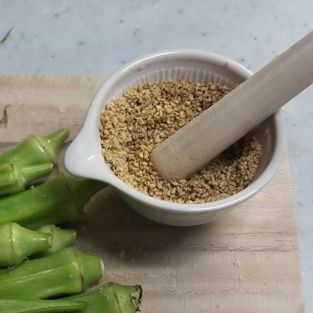 ①下準備です。オクラの色を鮮やかにするのと、余分なえぐみを取るために、塩を少々まぶしてまな板の上で塩ずりします。ごまを擦っておきます。