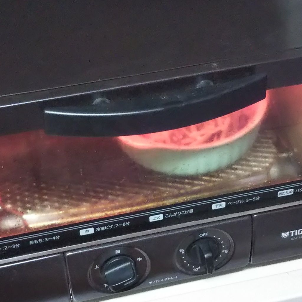 ④トースターで、焦げに気を付けながら、中火で10分焼いていきました。