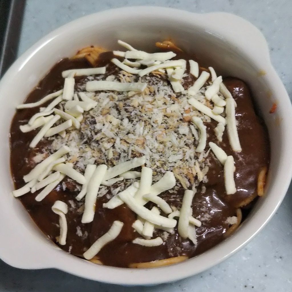 ①余ったミートソースパスタを、グラタン皿にのせます。
