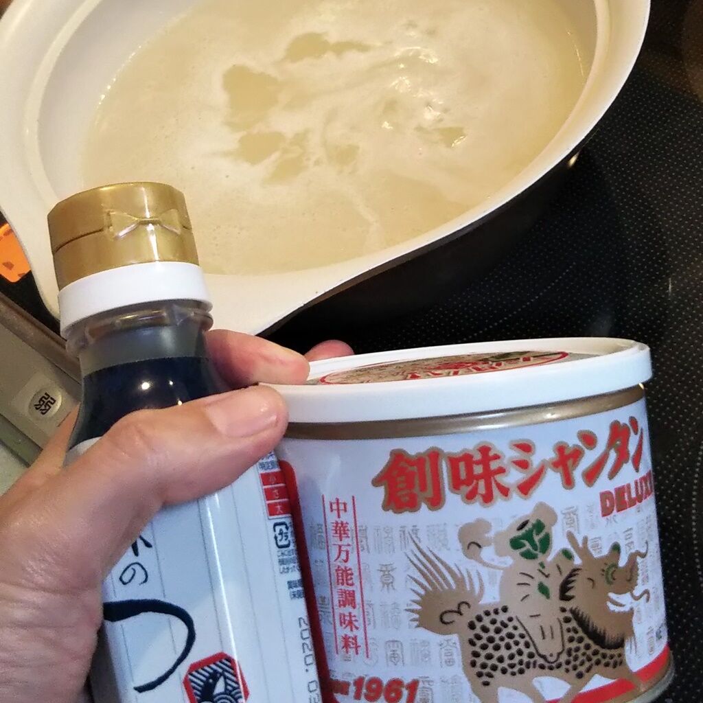 ④スープを作っておきます。創味シャンタンDX大さじ1と創味のつゆ大さじ1を水800mlに加え、加熱し溶かしておきます。