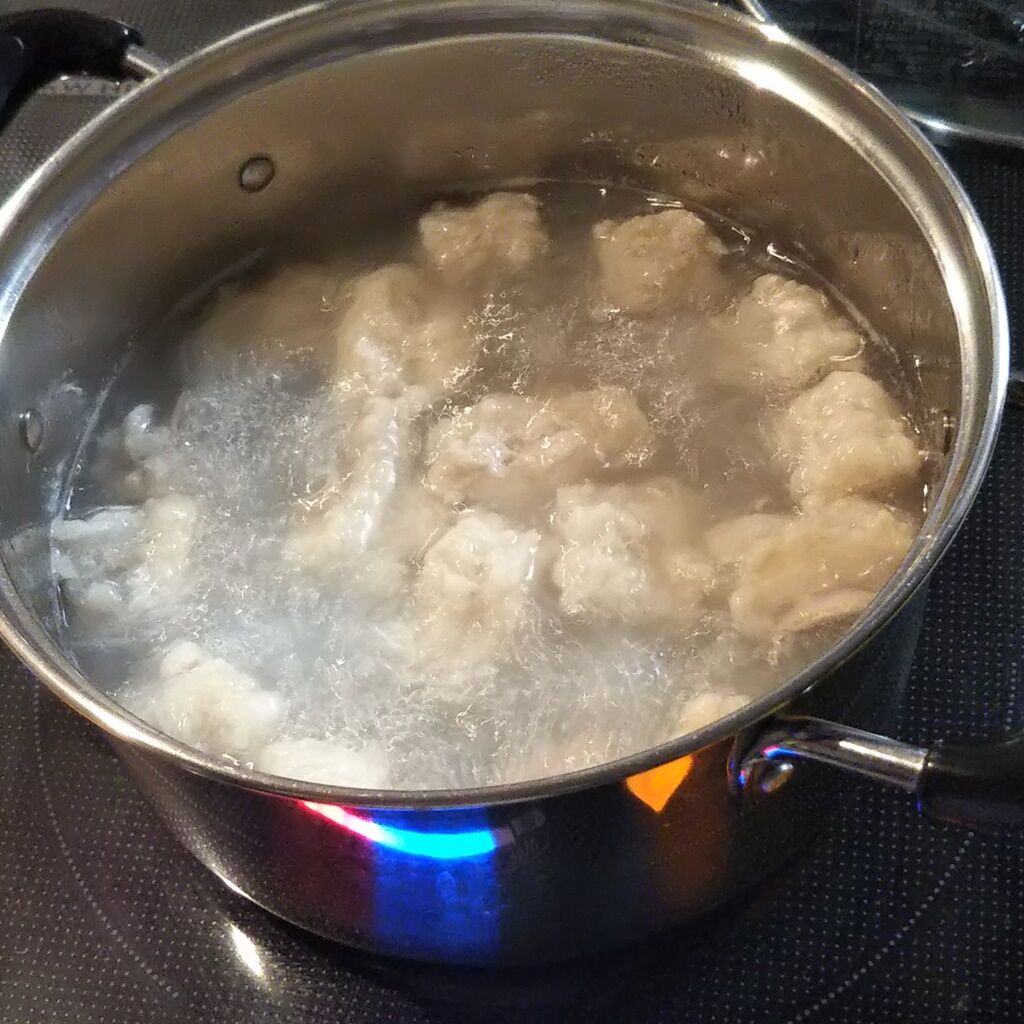 ③もつの下茹でです。多めの水を沸かし、もつを5~6分程度茹でて余分な油とアクを取り除いておきます。この作業で、もつの余分な臭みを取り除きます。