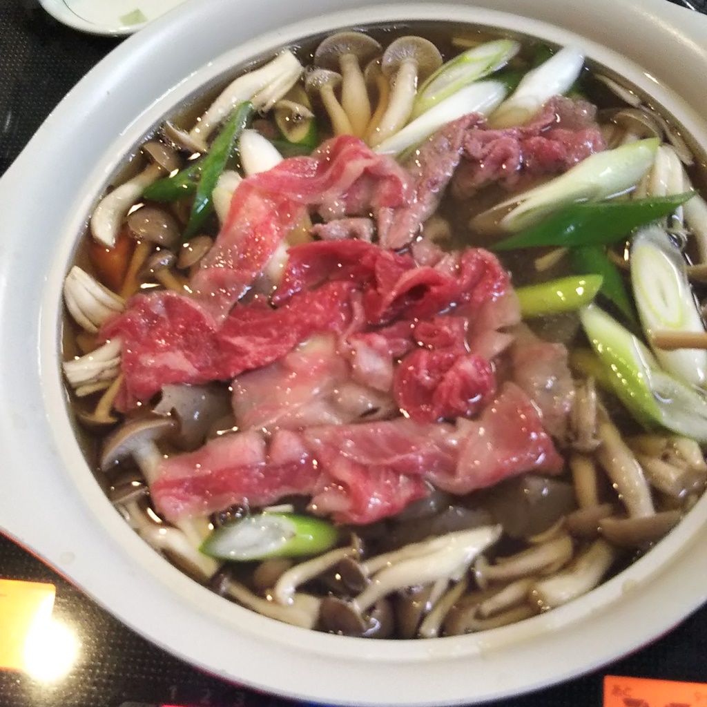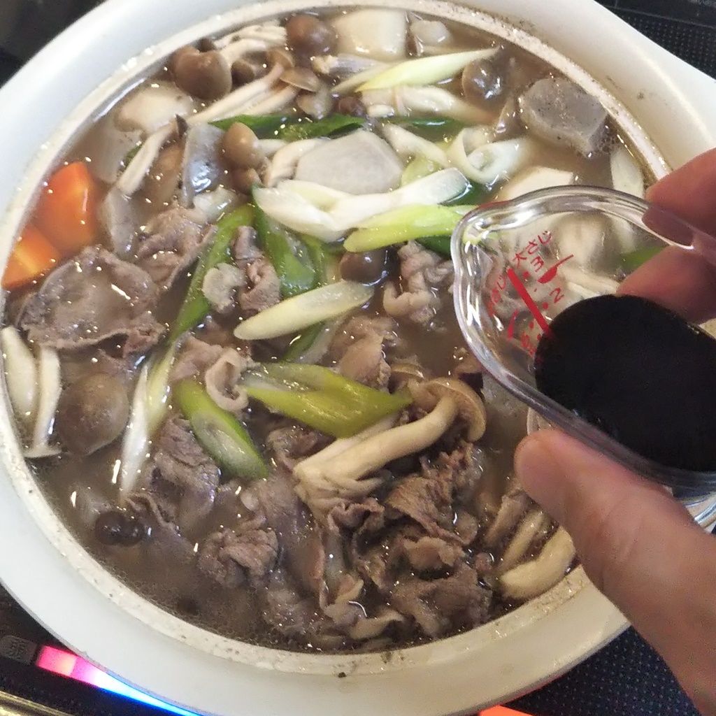 ④牛肉、ぶなしめじ、こんにゃく、長ネギを加えて、5分ほど煮ていきます。