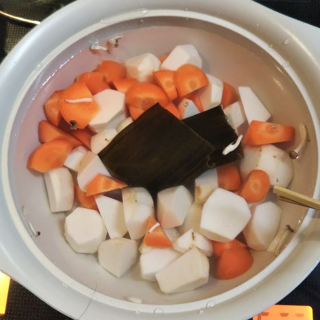 ②鍋に、水、里芋、人参、だし昆布を入れ、半分量の醤油・酒・砂糖を加えて強火にかけます。