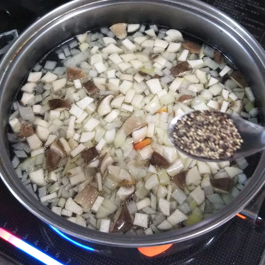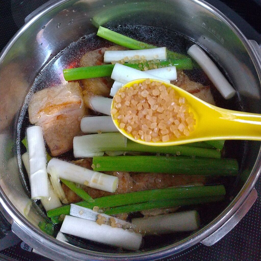 3.圧力鍋に、豚骨、水、醤油、焼酎、みりん、ザラメを加えて、蓋を閉めて、沸騰するまで強火にかけます。沸騰したら、弱火にし、20分煮込みます。