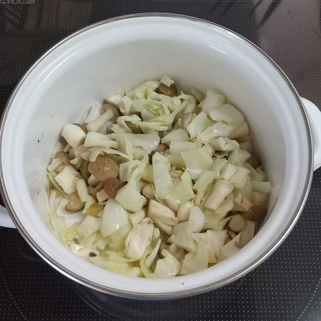 ざくざくに粗みじんにしたキャベツとぶなしめじを軽く炒めて、