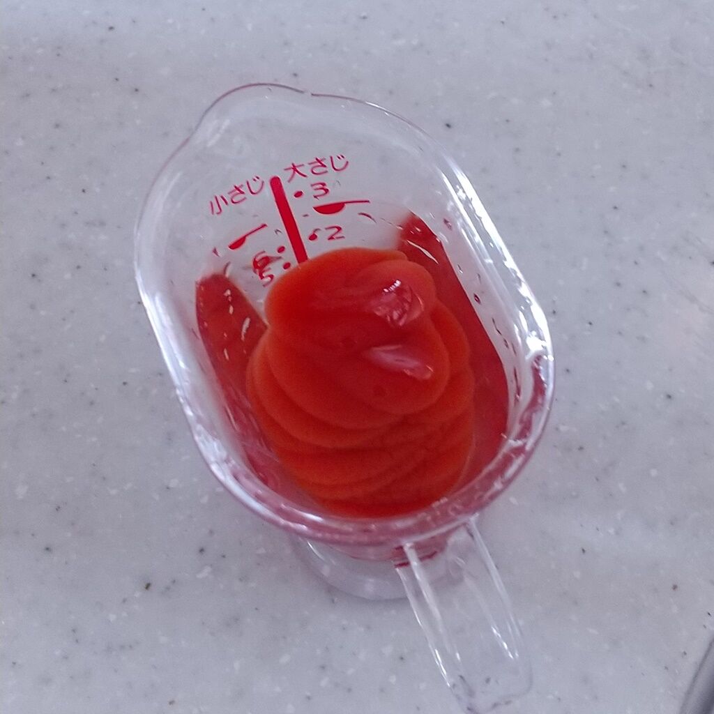 2.フリーザーバッグに鶏肉を入れ、料理酒、ケチャップ、ウスターソース、オリーブオイルを加えます。料理酒のなかにケチャップを入れると、きちんと大さじ2はかれますよ~。