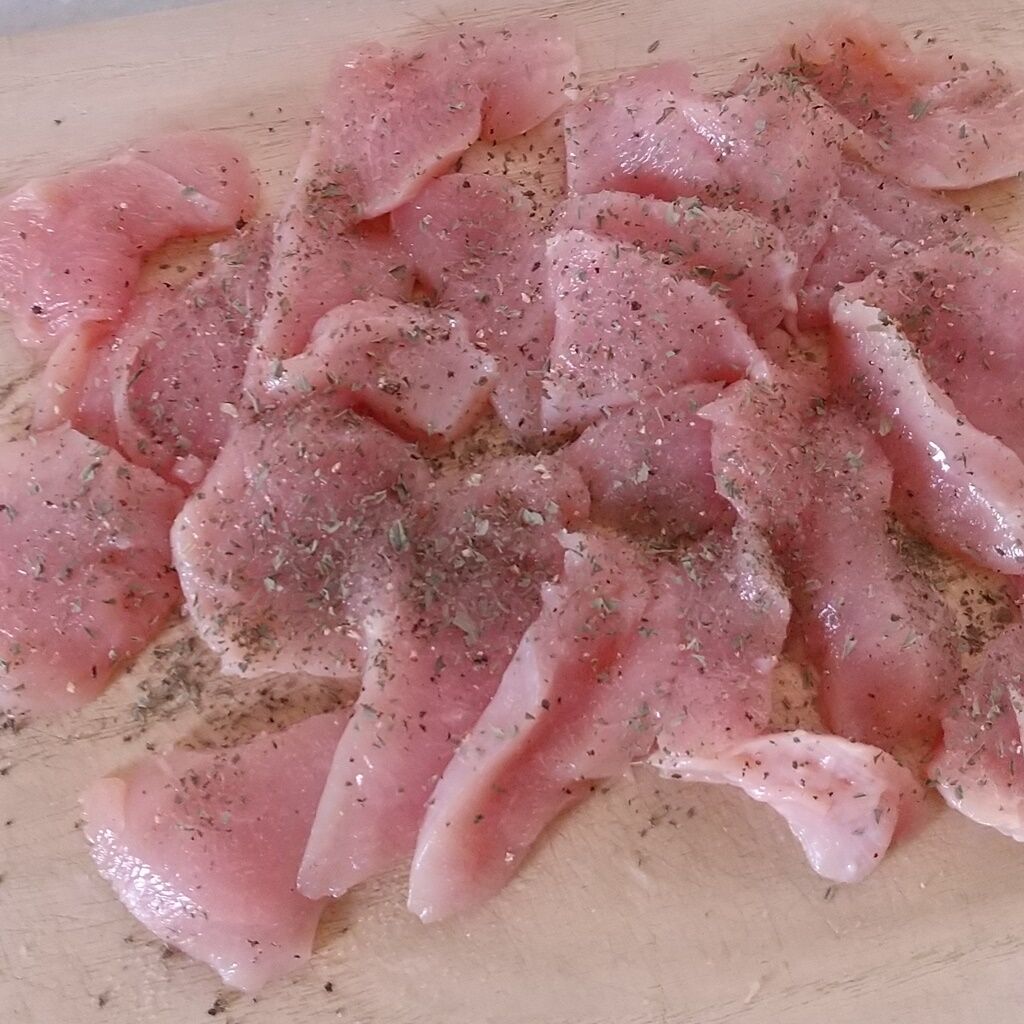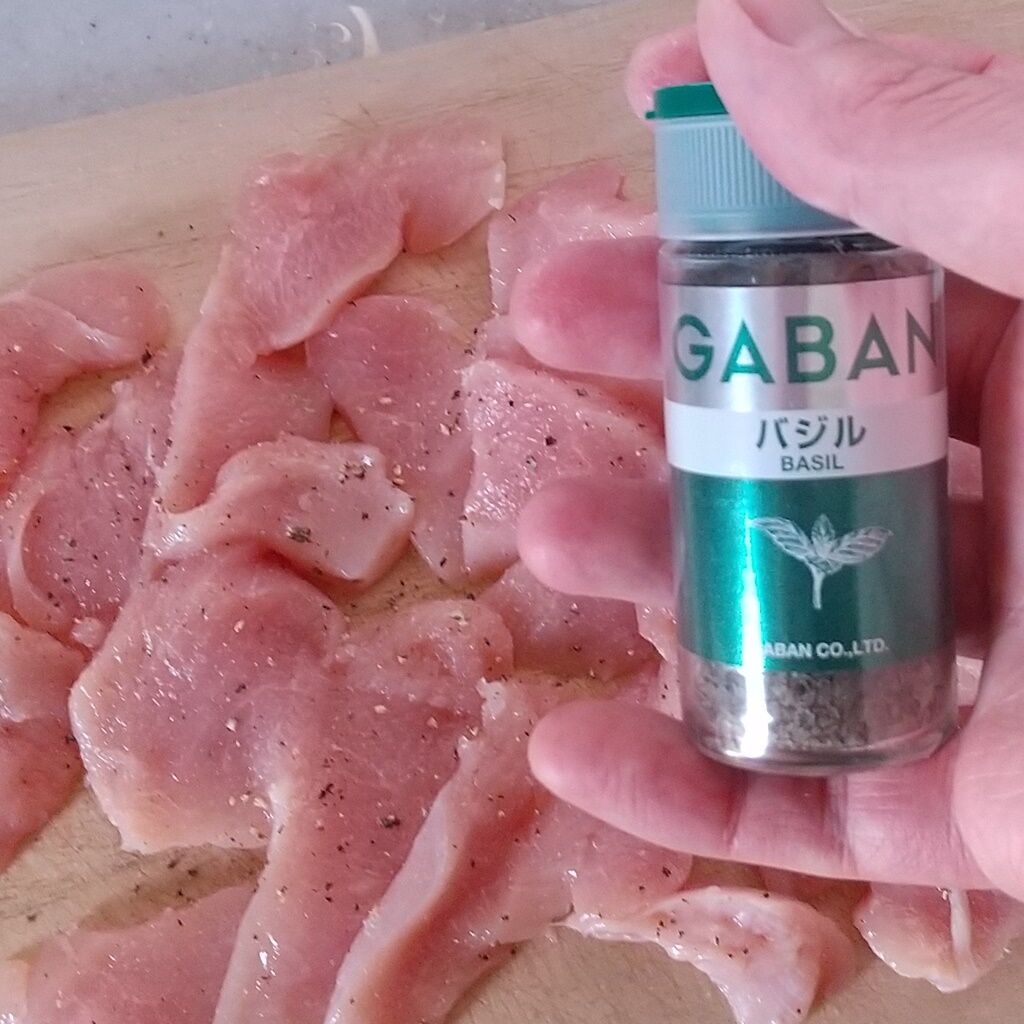 1.鶏むね肉の皮を取り、縦半分に割った後、そぎ切りしていきます。塩・こしょう、乾燥バジルを振っておきます。