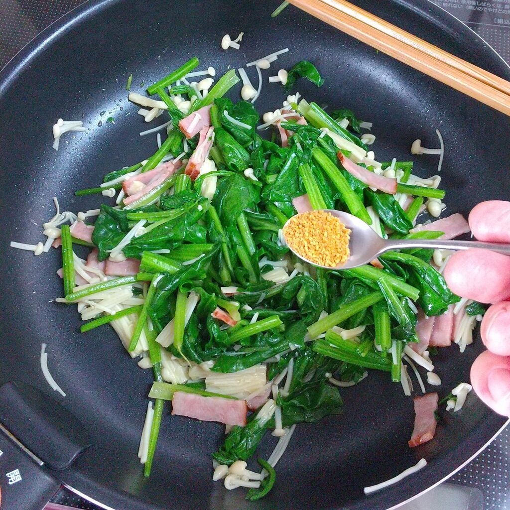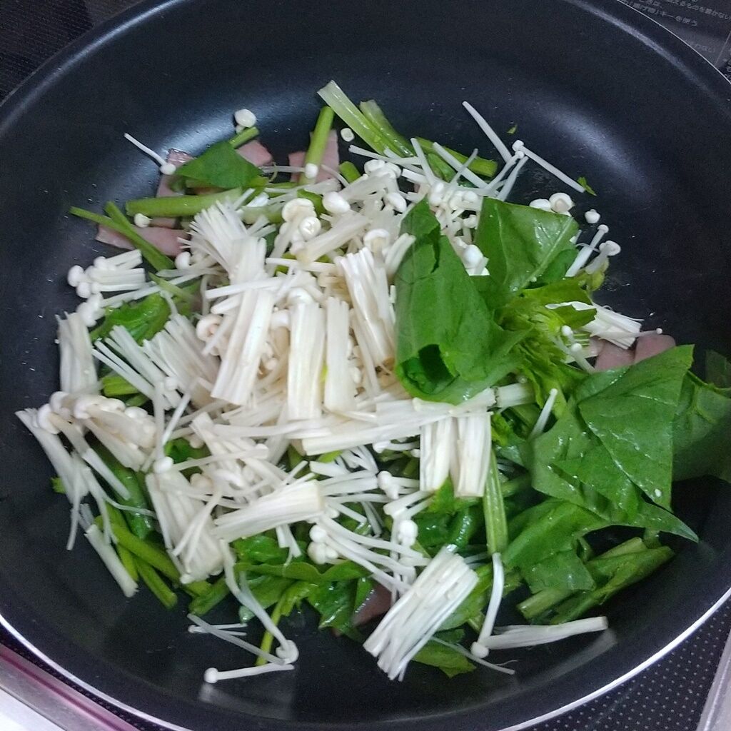 3.なんかいい感じに色づいたら、ほうれん草の茎とえのきを先に炒めます。