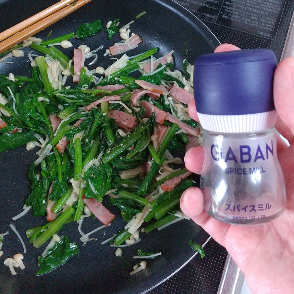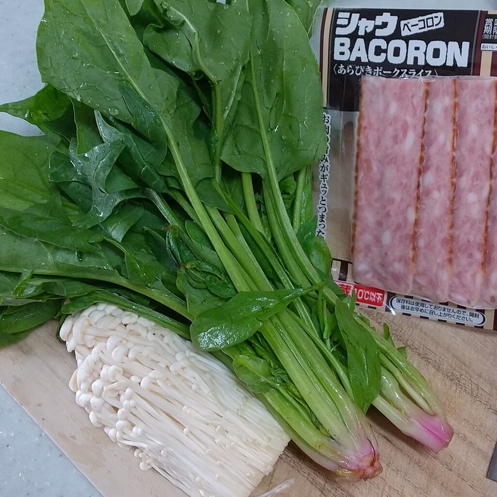 今日の料理は、シャウベーコロンを使用した『ほうれん草とえのきのソテー』です。
