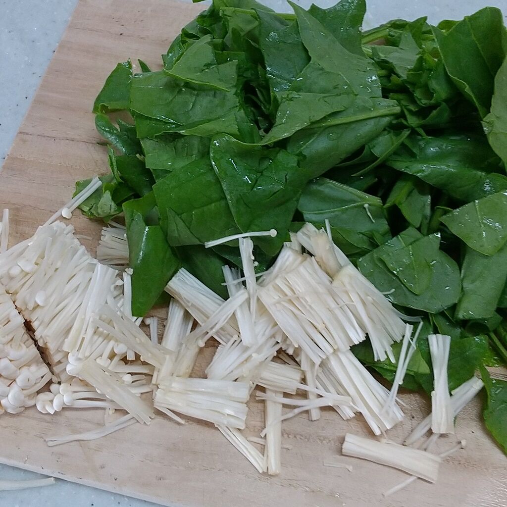 1.ほうれん草、えのきを3~4㎝幅に、シャウベーコロンを5㎜幅くらいに切っていきます。