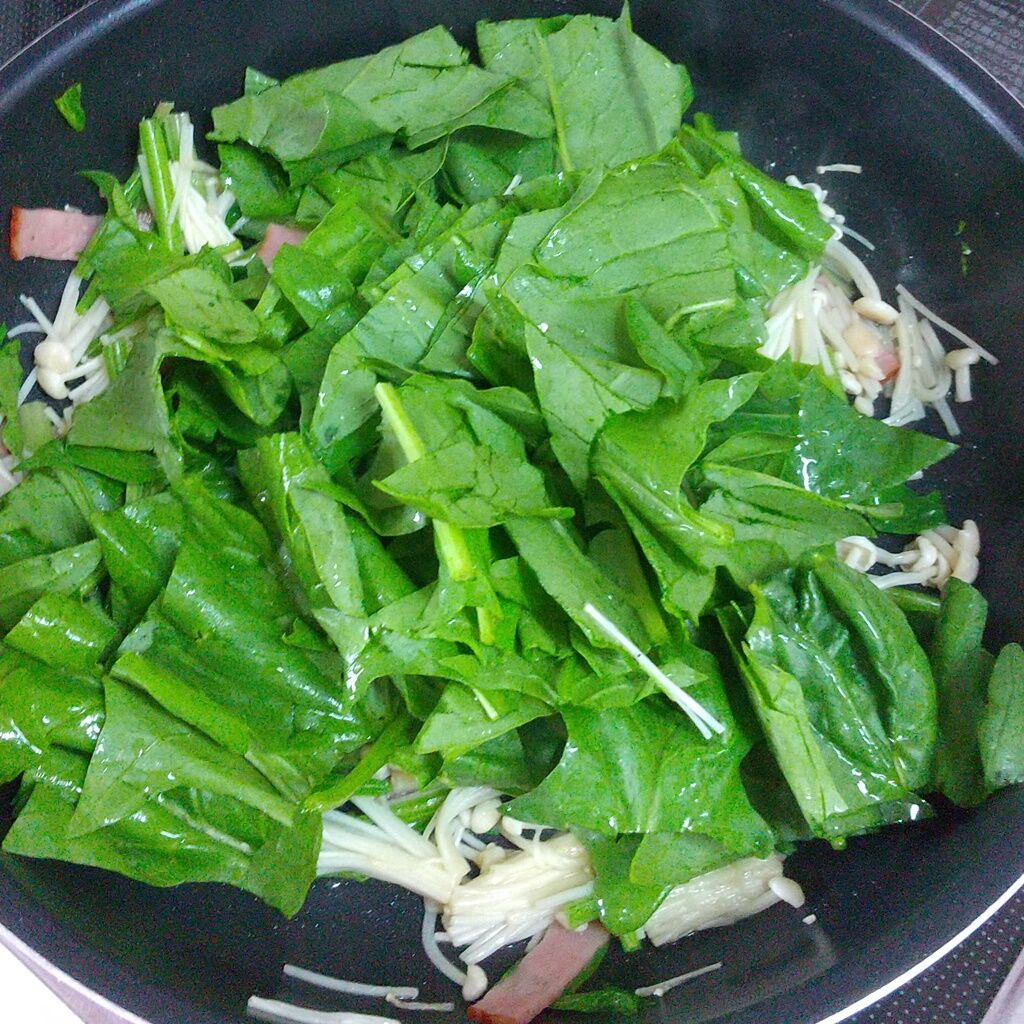 4.ほうれん草の茎とえのきに火が通ったら、残りの葉を加えます。