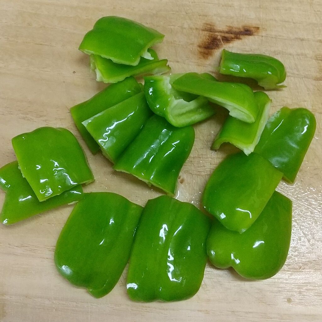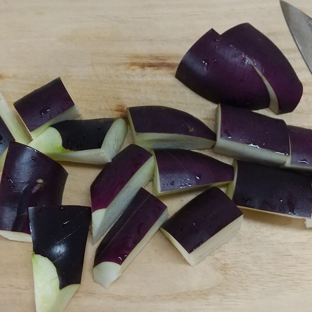 1.茄子とピーマンを食べやすい大きさに切っていきます。大振りな茄子でしたので、縦1/4に割ったものをさらに、8分割にしています。ピーマンは、縦に四つ割り、横に2つに切ってます。