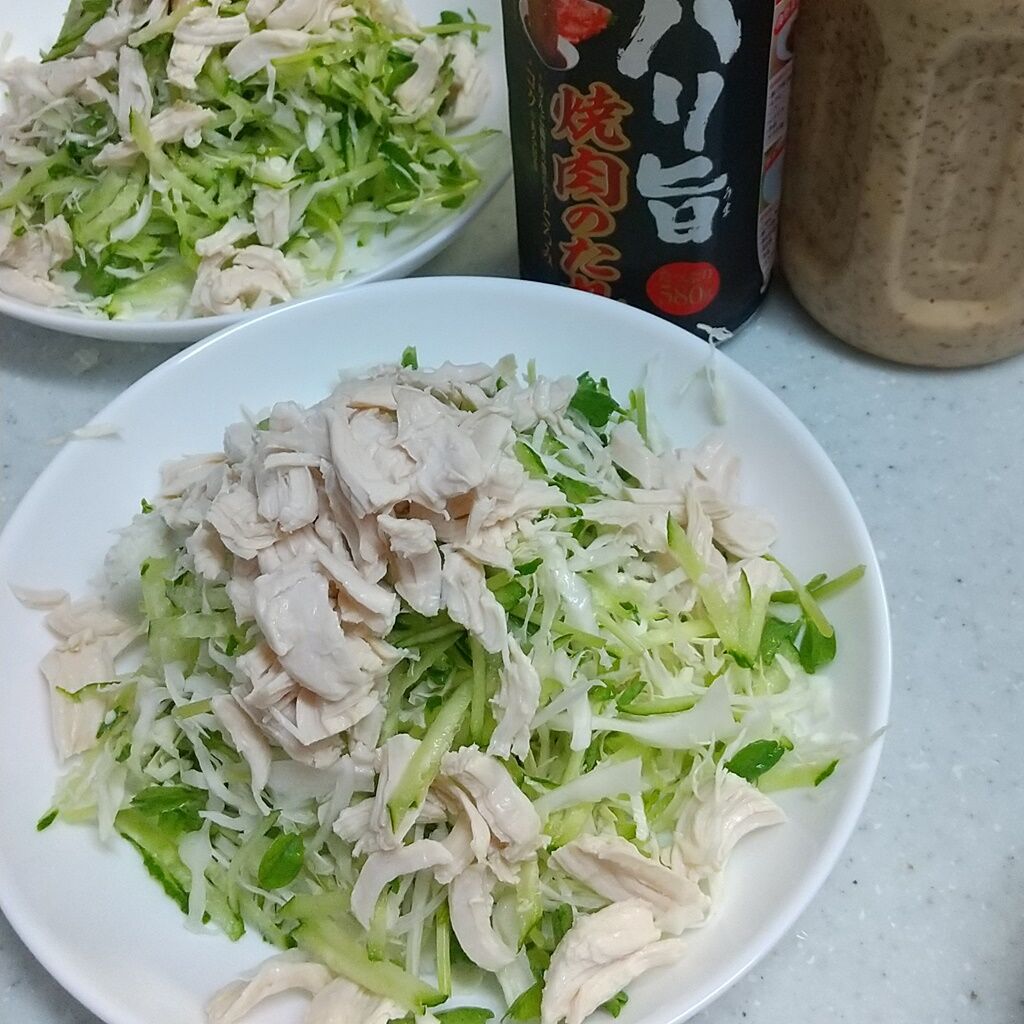 あとは、千切りキャベツと胡瓜をお皿に盛り付けて、茹でた鶏のささみを、よくほぐしたものをのせたら、いただきま~す。