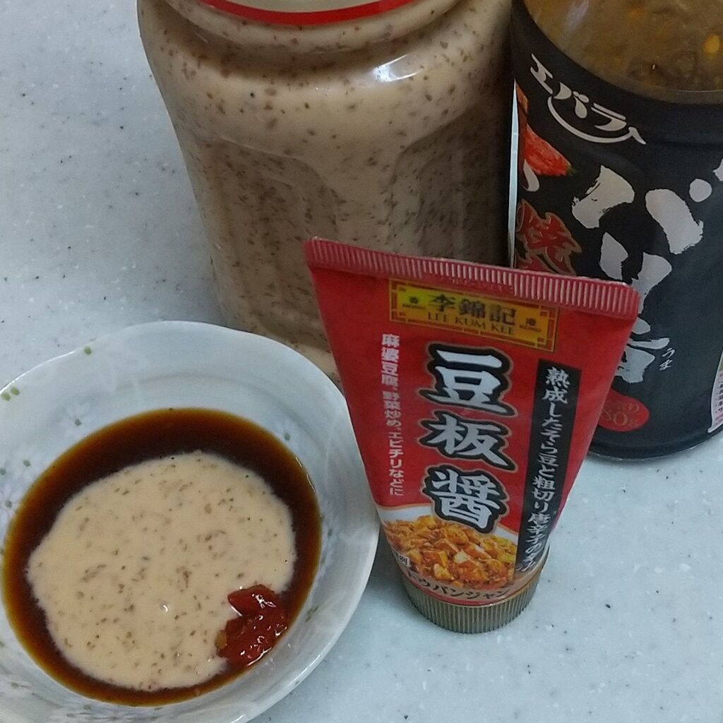 1.胡麻ドレッシングと焼き肉のタレ、豆板醤を、深めの小皿に加えて、よく混ぜ合わせます。
