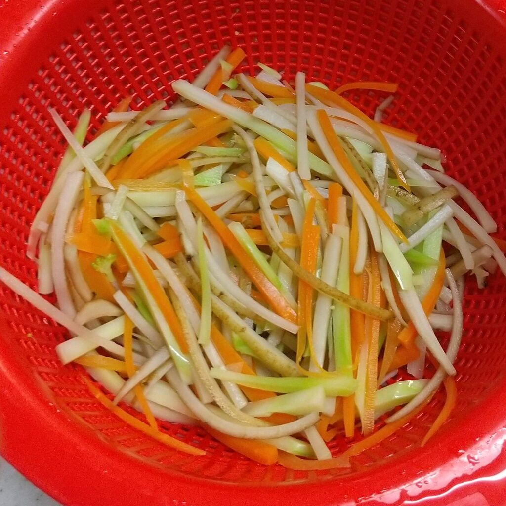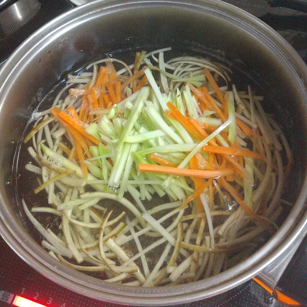 2.ごぼうを30秒ほど茹で、ブロッコリーの茎と人参を加えて、さらに30秒ほど茹でます