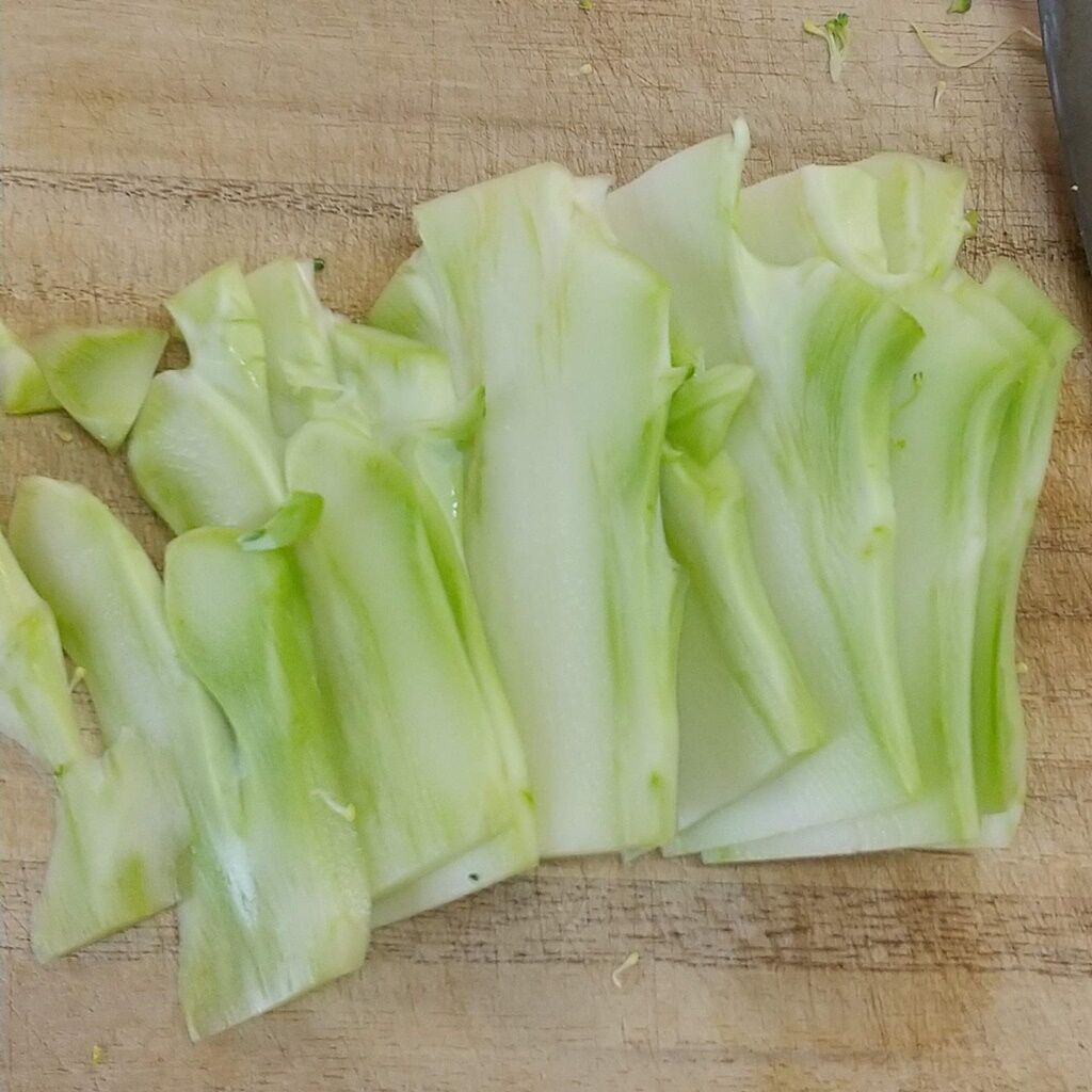 ・余ったブロッコリーの茎は、下の乾燥している部分を切り取り皮をある程度むいておきます。薄くスライスしたあとに細く切っていきます。