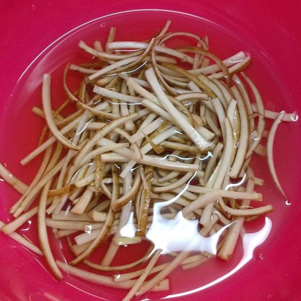 ・ごぼうは、土が落ちるまで洗い、4㎝幅に切りスライスして細く切ります。水につけ、2~3回水を替えたあとは、酢(分量外)を少々加えます。酢の効果で色が付きにくくなります。