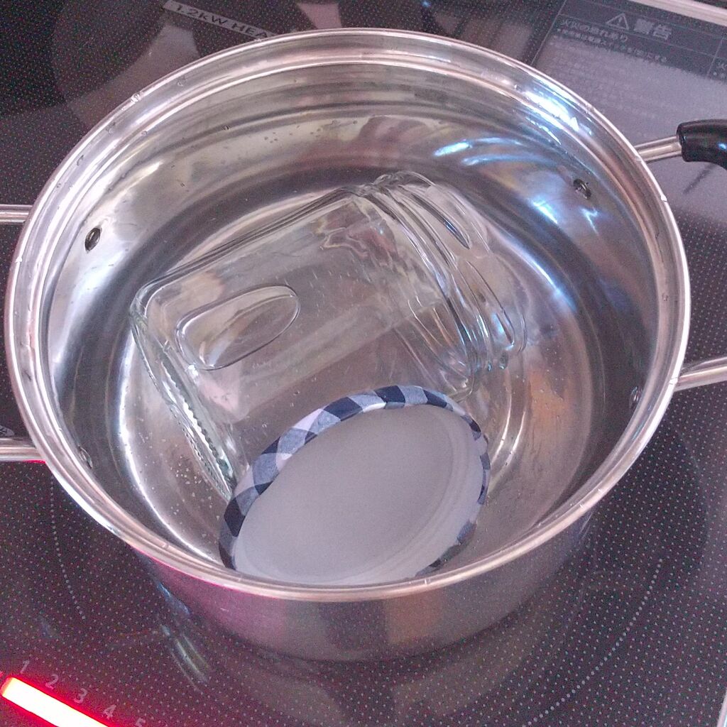 ・保存用のガラス瓶を煮沸消毒しておきます。洗っておいたガラス瓶を鍋に水でひたひたになるように入れ、沸騰して5分間加熱します。その後よく乾燥させておきます。