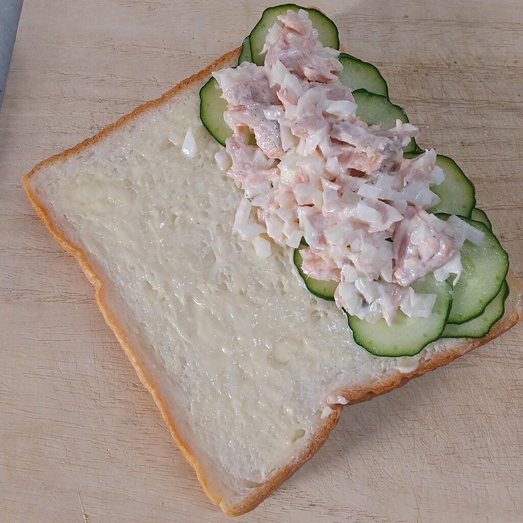 3.食パンにマヨネーズを塗って、胡瓜、1のサラダサーモンを挟んだら出来上がりです。