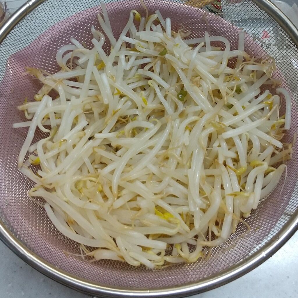 1.もやしをボウルに入れラップをふんわりかけて、電子レンジ600Wで3分加熱します。火傷に注意しながら、流水であら熱を取って水気を絞ります。