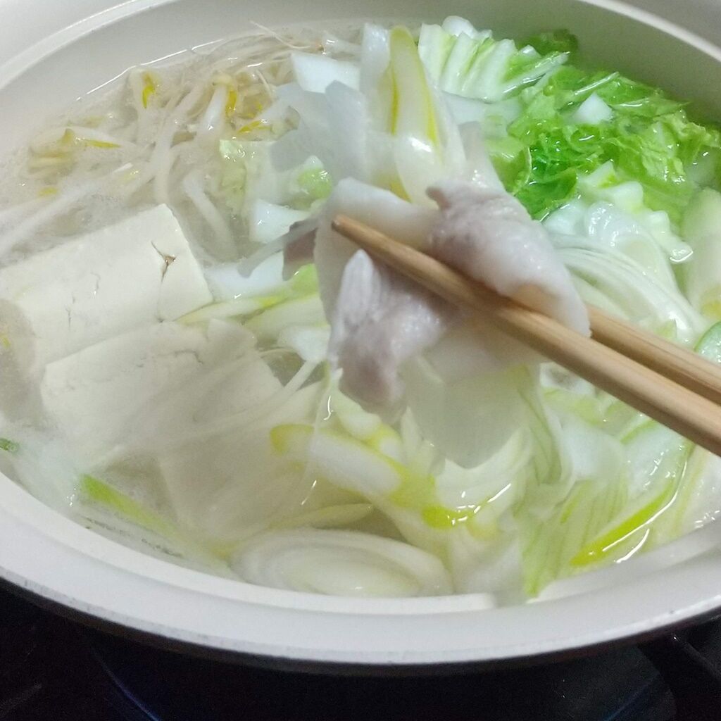ある程度野菜に火が通ったところで、豚ばら肉をしゃぶしゃぶして下さいませ。