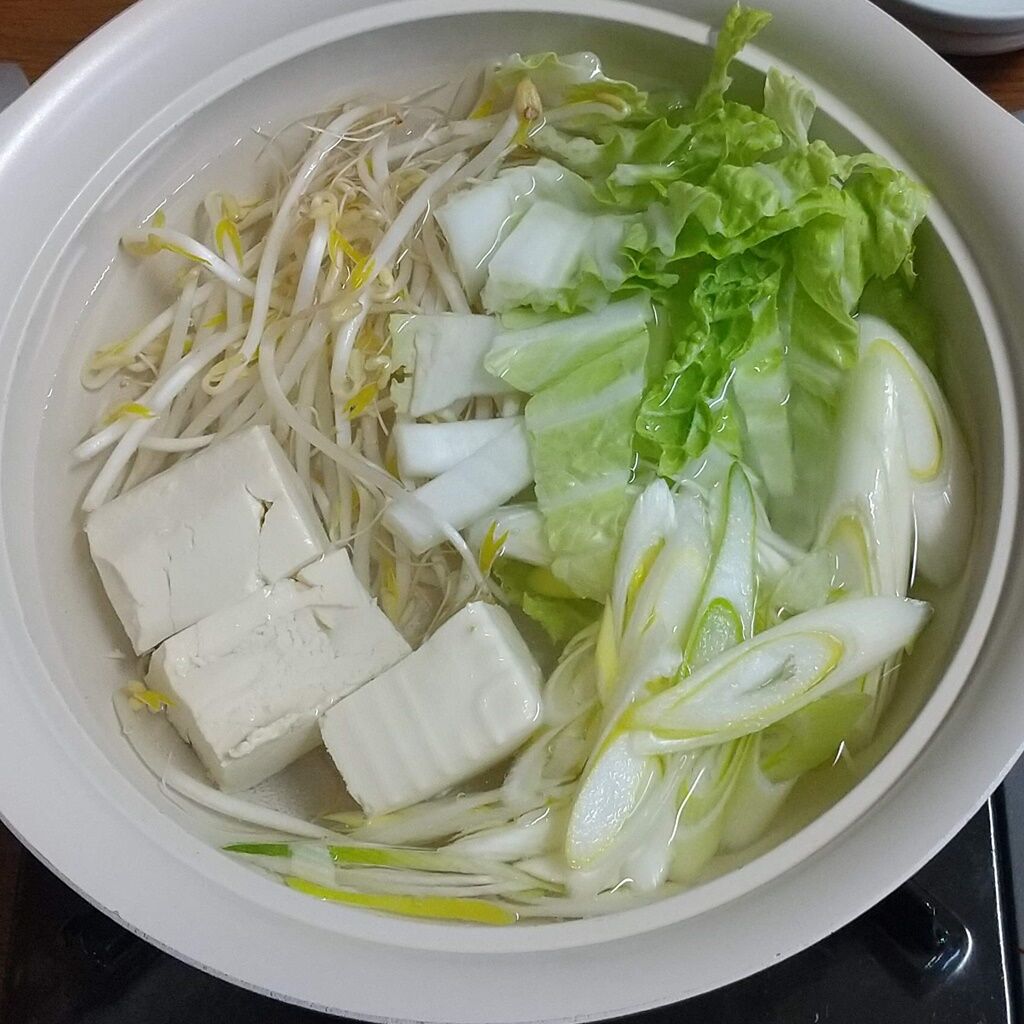3.豆腐、白菜、もやし、白ねぎと火の通りにくい順に入れていきます。
