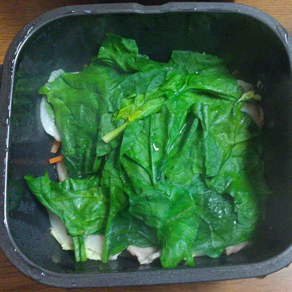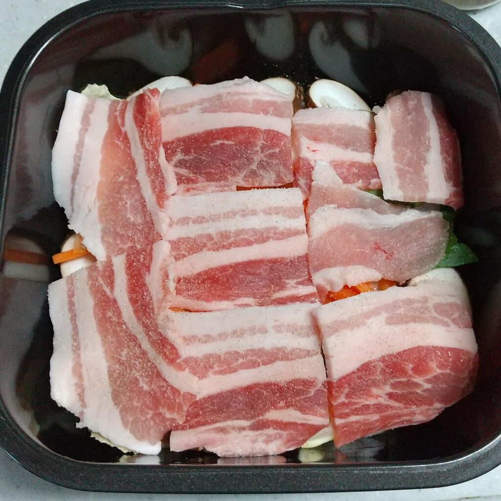 3.グルラボプラス大に、白菜、人参、椎茸、豚バラスライス、ほうれん草の順に並べていき、本だし、料理酒、水を振りかけます。