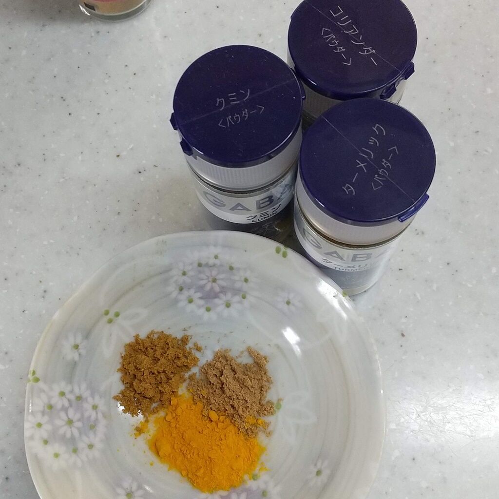 ・クミン、コリアンダー、ターメリックを計っておきます。