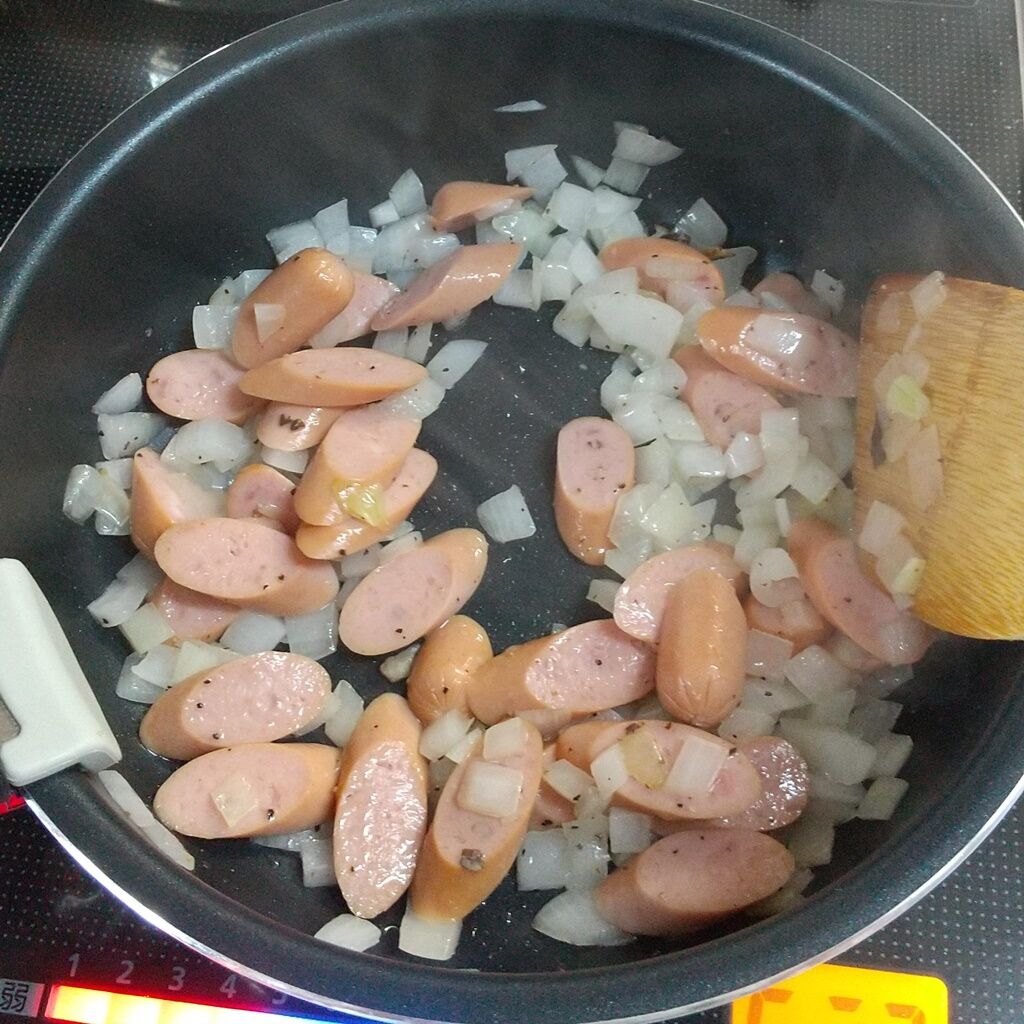 1.霜降りヒラタケ、玉ねぎをみじん切りに、皮なしロングウインナーを斜め切りにスライスします。