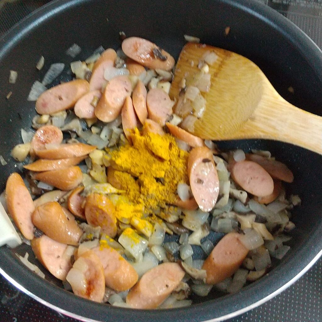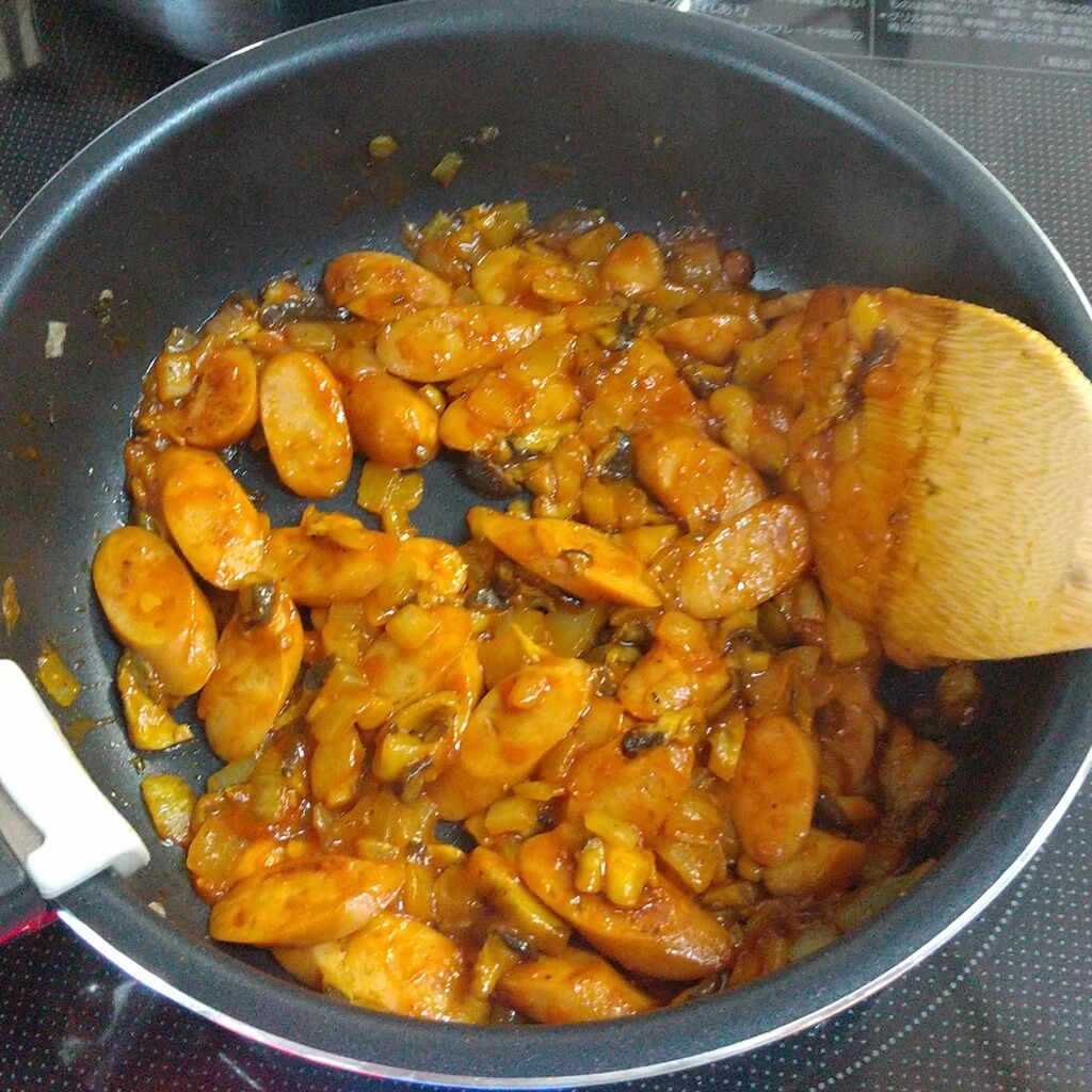 ソーセージをキノコと玉ねぎと炒めたものに、カレーに使うスパイスで味付けするので、