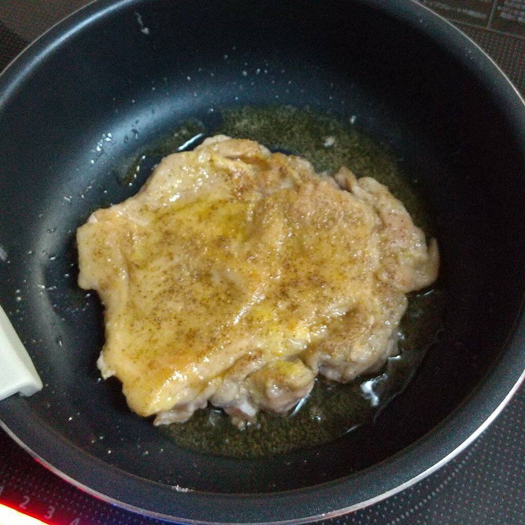 4.フライパンに、ごま油をひき中火にかけて、2の鶏もも肉を皮目からじっくりと焼いていき、裏返して両面焼き上げます。