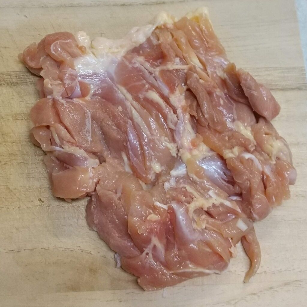 1.鶏もも肉のすじを切りながら、なるべく厚さが均一になるように広げていきます。