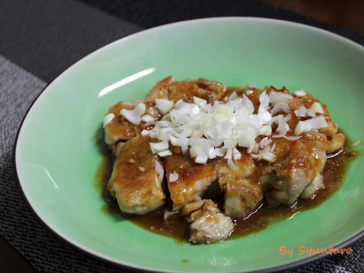 6.鶏もも肉を食べやすい大きさに切り、5のソースをかけ、みじん切りにした長ネギを盛り付けて出来上がりです。