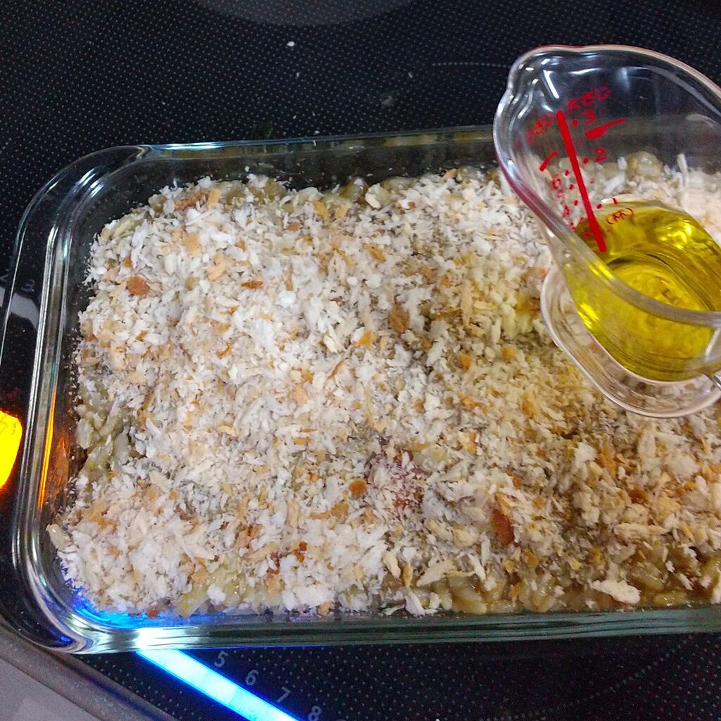 3.パン粉をまんべんなく振りかけて、オリーブオイルを回しかけます。