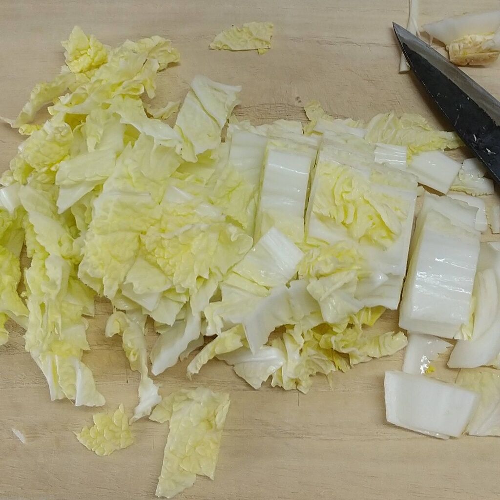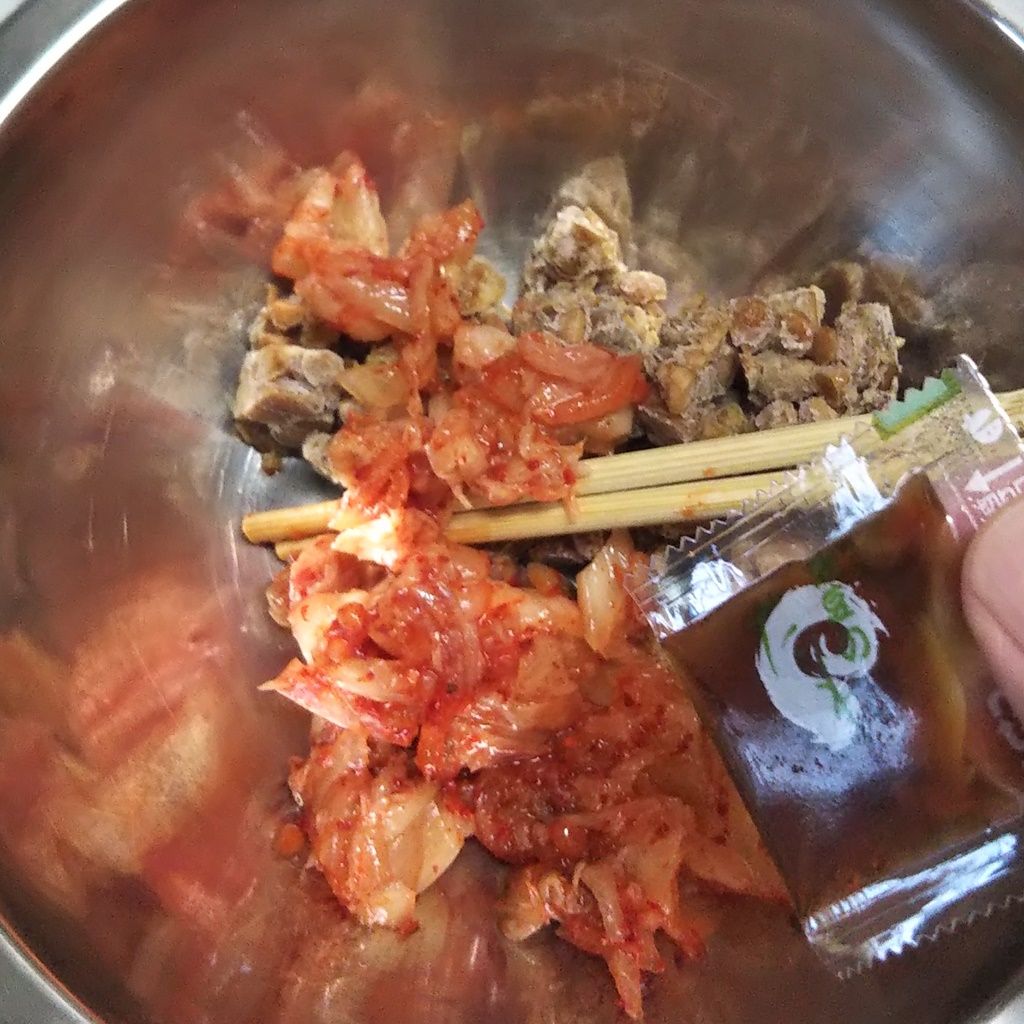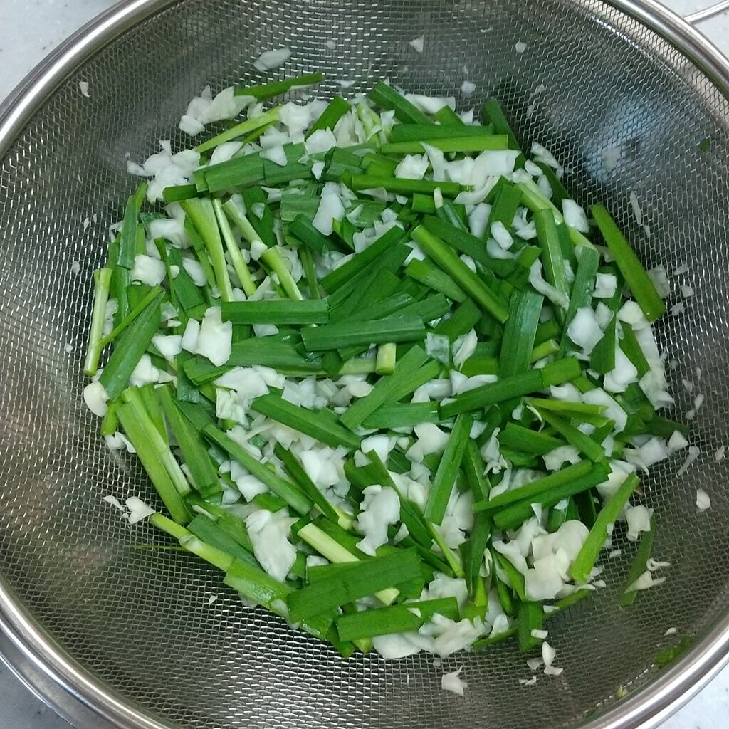 1.納豆を粘りが出るまで、タレを加えてよくかき混ぜます。ニラを3~4㎝の長さに切っていきます。