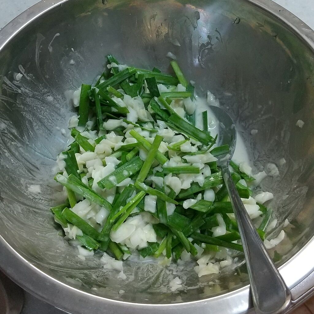 2.薄力粉と片栗粉に水と卵を加えて、よく混ぜて溶いたら、ニラと納豆を加えて、さっくりと混ぜ合わせます。