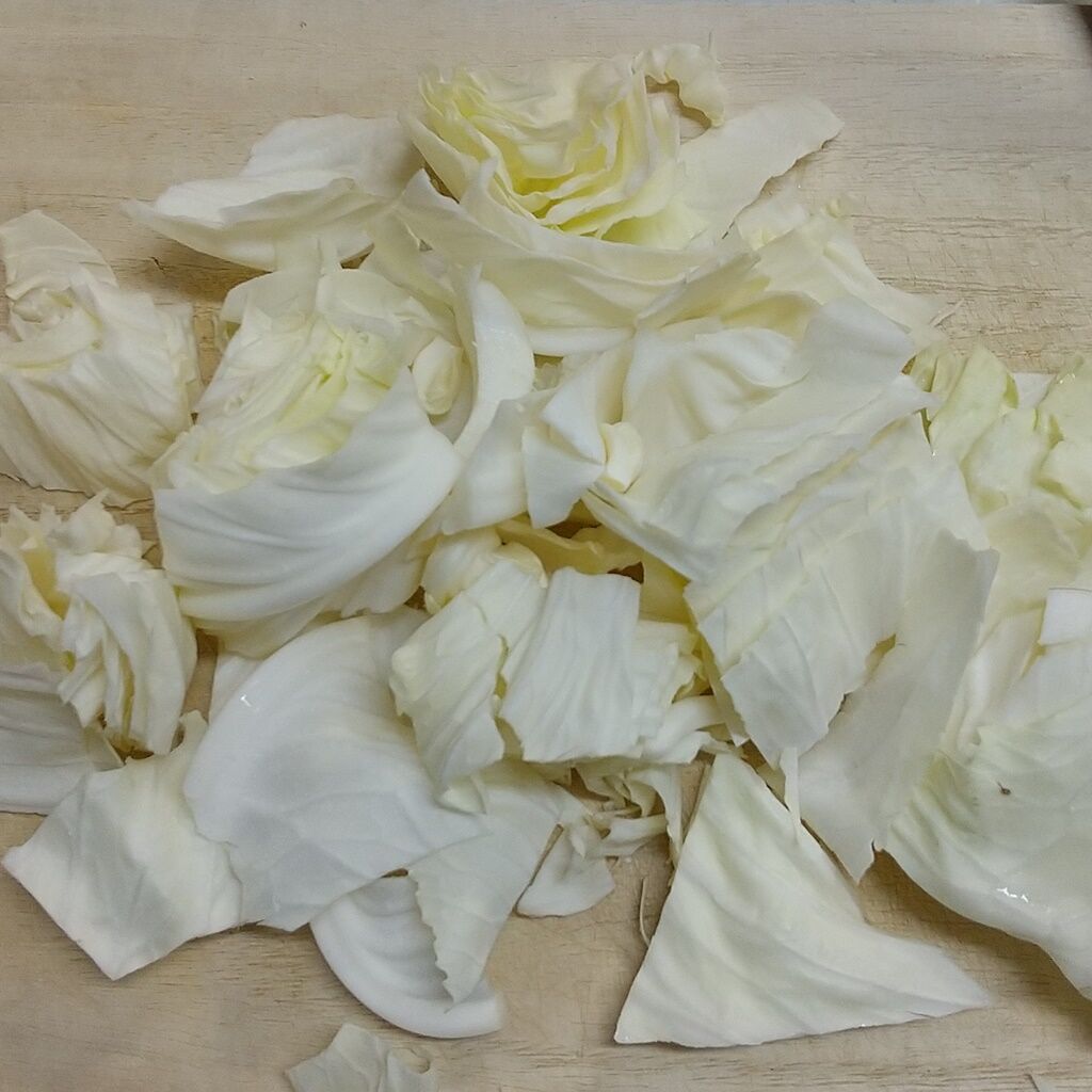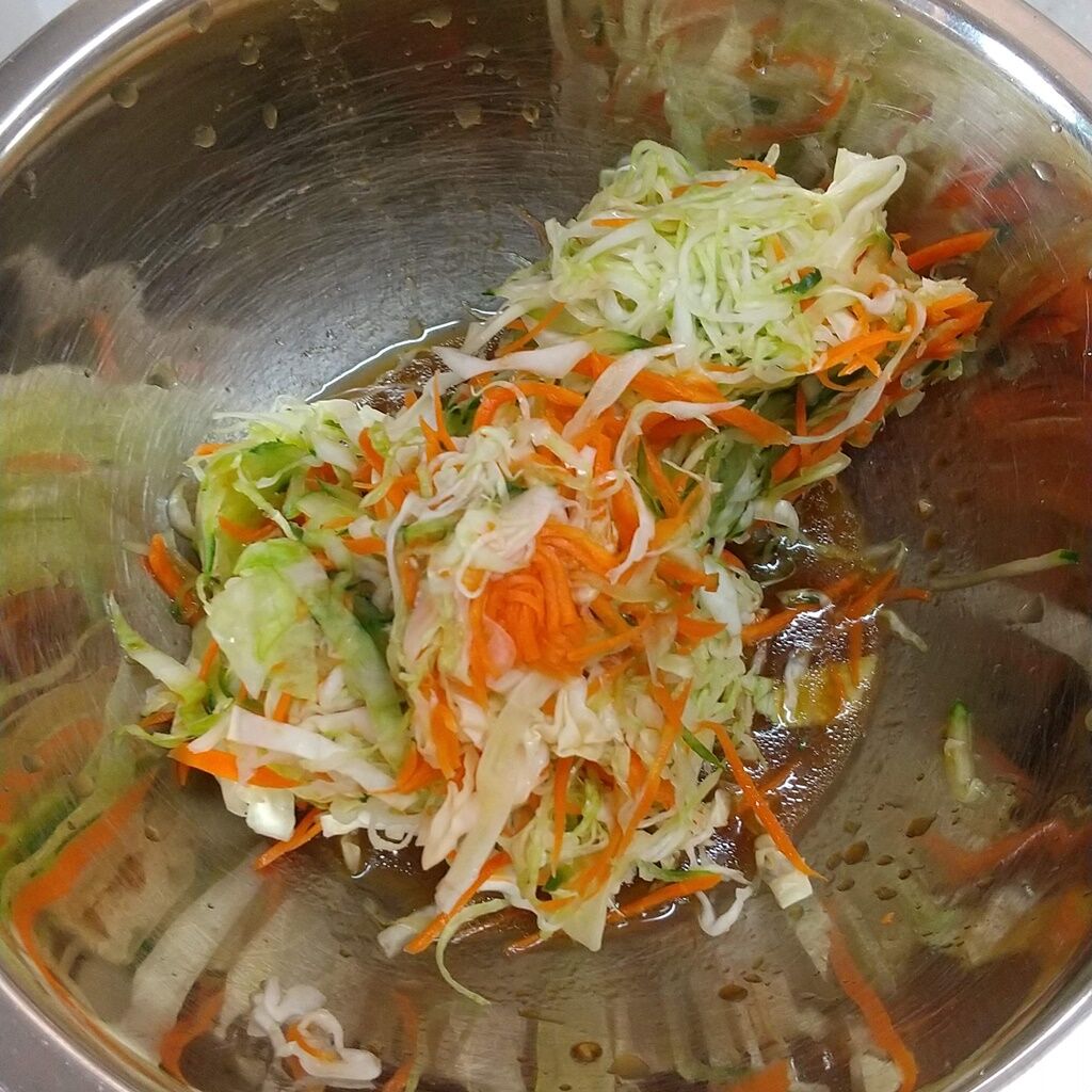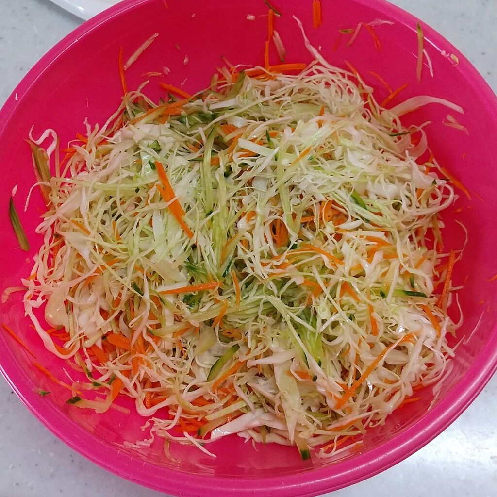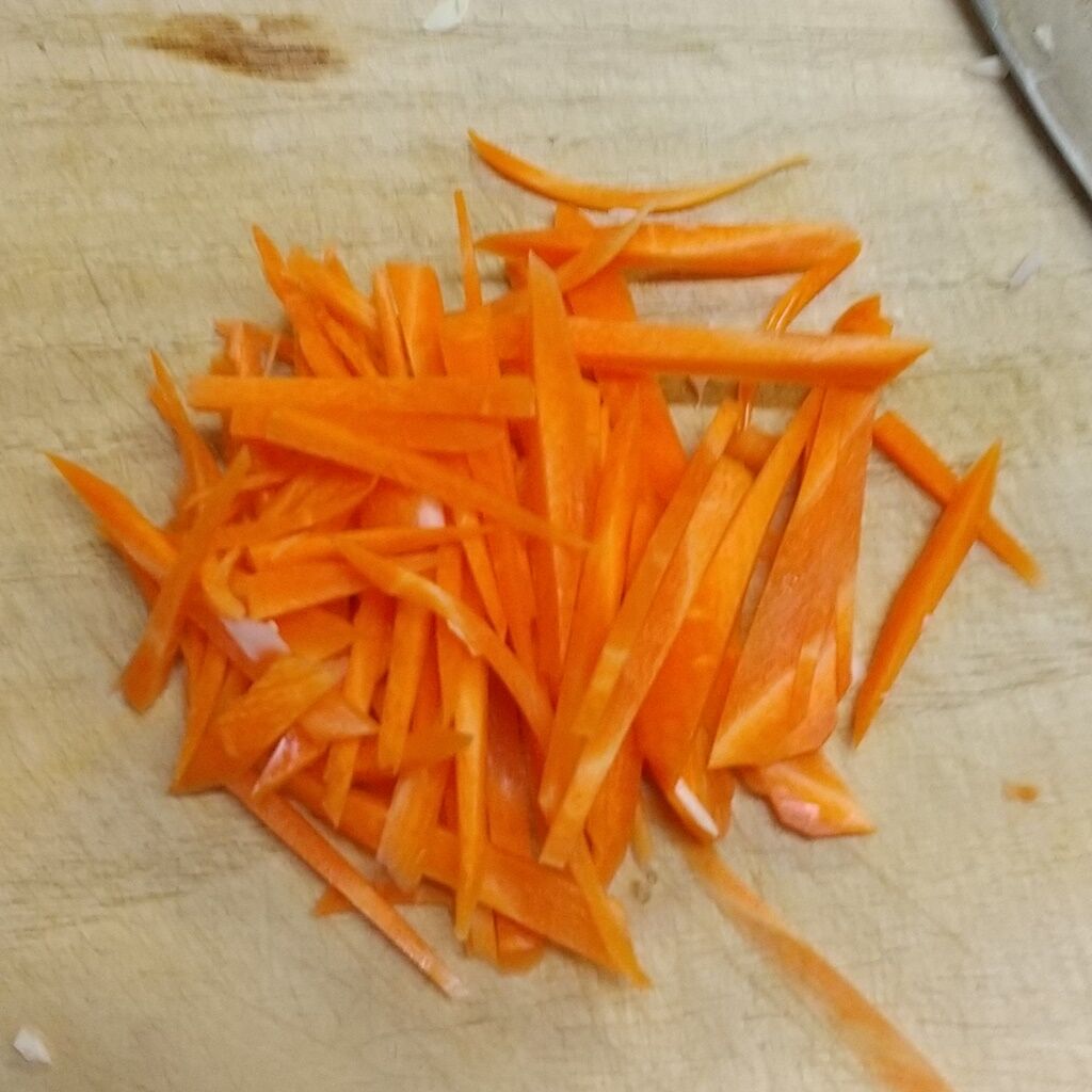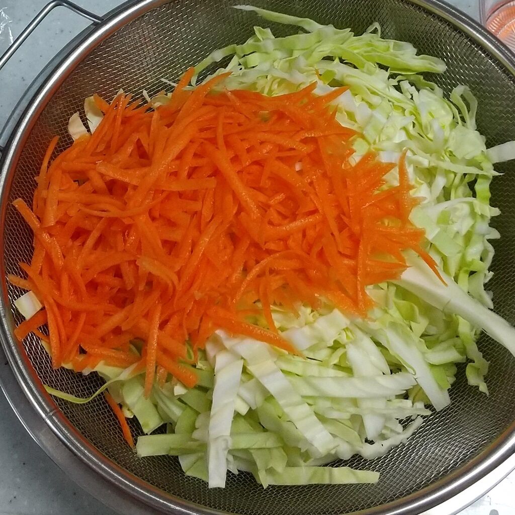 1.キャベツを太めの千切りに、人参をスライサーで千切りにします。
