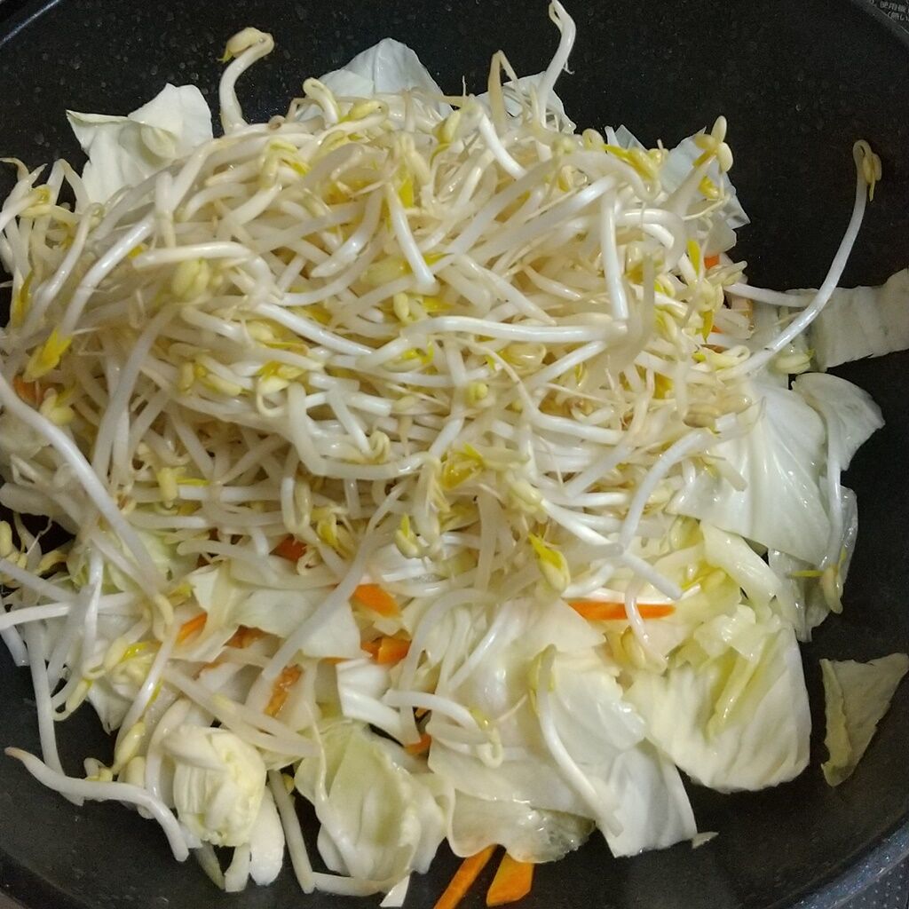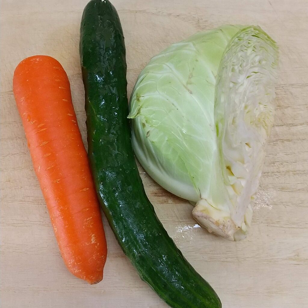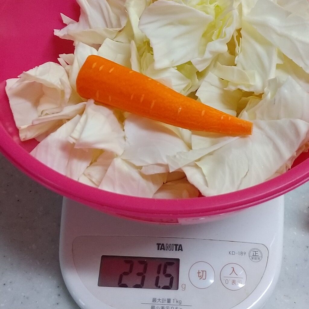 ちまたで有名な、湯通しキャベツがありますが、キャベツだけだと彩りと栄養も足りないかと思い、人参も一緒に湯通ししています。