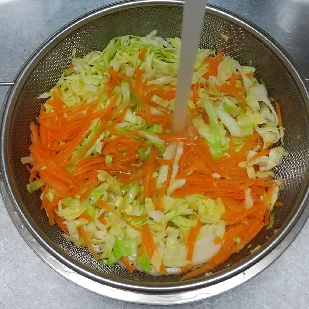 2.お湯を沸かし、キャベツと人参を湯通しして、流水であら熱を取ります。