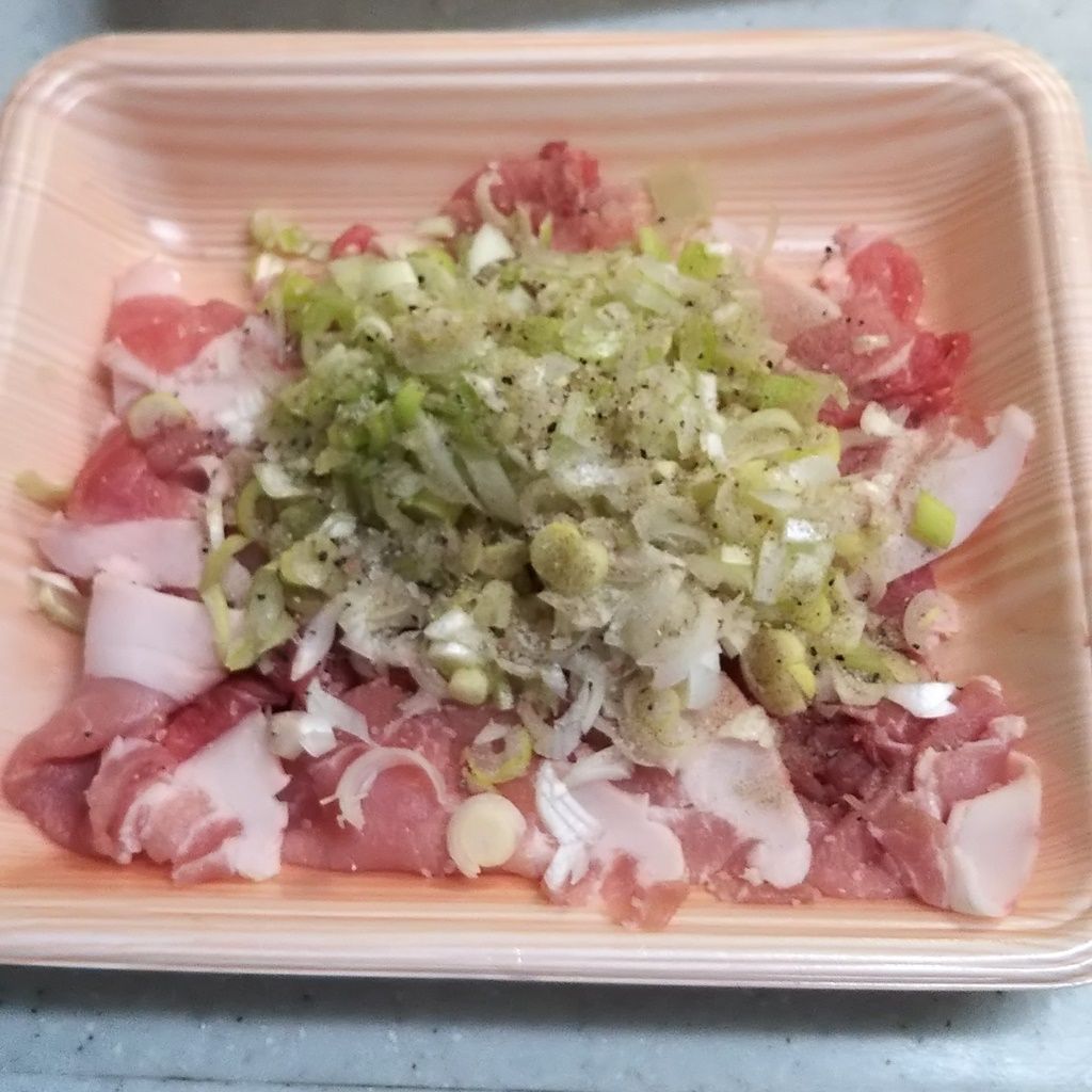 ②中火で、豚肉を炒めながら塩コショウを振ります。